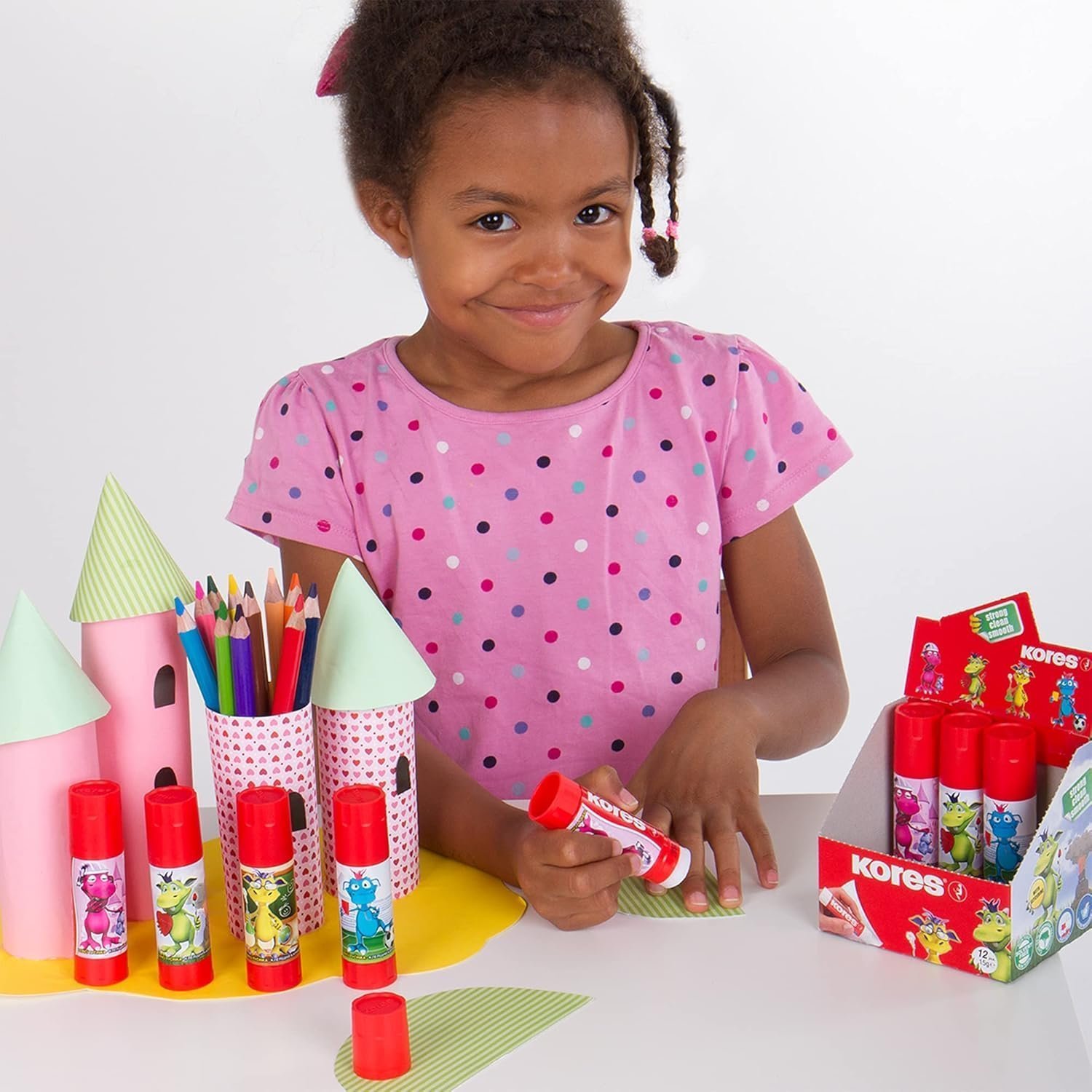 - Product: Kores Fantasy Glue Stick is a solid and highly effective glue stick for school supplies in 4 attractive fantasy designs for kids, great for arts and crafts activities; easy to use, the product provides clean and quick drying
